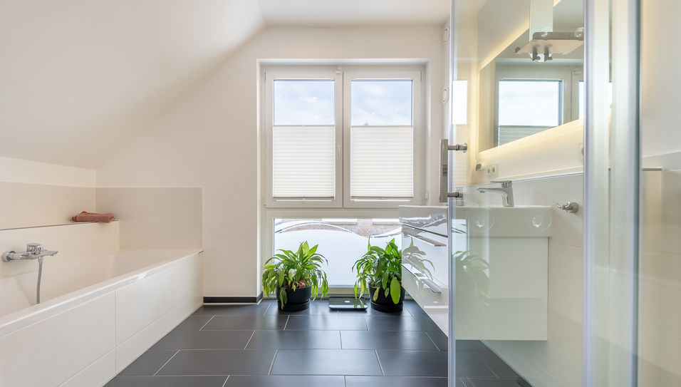 - Wellness-Badezimmer mit Tageslichtfenster, Badewanne und Regendusche; Ausstattung Villeroy und Boch und Dornbracht